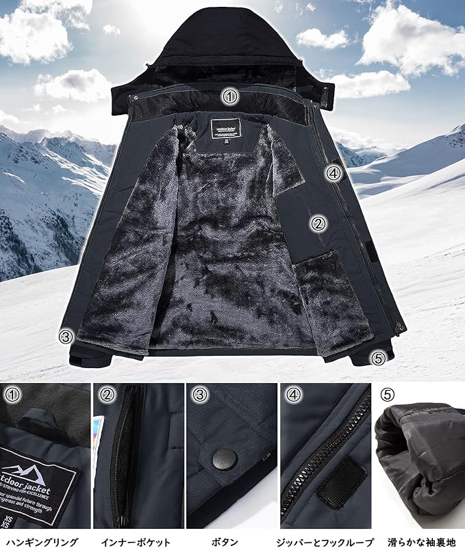 [TACVASEN] アウトドアジャケット メンズ 多機能 マウンテンパーカー 防風 防寒 登山服 裏ボア 保温 撥水性 ウインドブレーカー 登山ジャケット フリース 裏起毛 フード付 取り外し可能 e