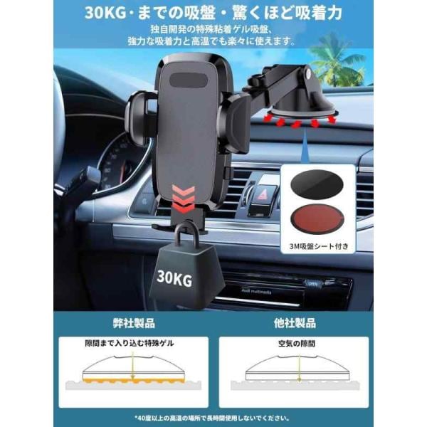 最新改良された超強力真空粘着ゲル吸盤を採用、3M吸盤シートも付き、吸着力が倍増し、ダッシュボードや窓など平らな場所でも取り付けられます、車の表面の革を傷つけず、跡も残らないです。