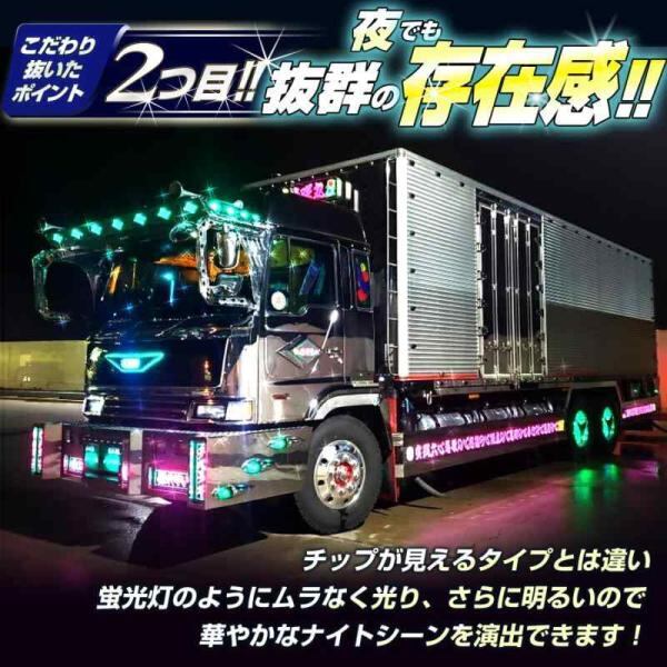 ?選ばれるポイント2つ目【夜でも抜群の存在感】 竹村商会の24v ledテープライト 5m 防水タイプは、チップが見えるタイプとは違い、蛍光灯のようにムラなく光り、 さらに明るいので華やかなナイトシーンを演出できます値段より質をお求めの方には大人気です