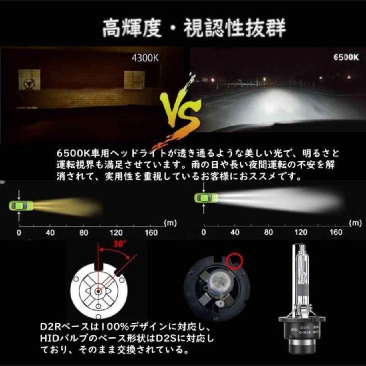 【発光抜群・視認性抜群】アップグレード版純正HID D2R 6500kのHID電球,で明るいホワイト。ハロゲンランプや通常のHID 6000K 電球に比べて視認性を大幅に高めている、光の射距離はさらに長い、より良い明るさ、最適な配光を実現。雨の日や長い夜間運転の不安を解消されて、実用性を重視しているお客様におススメです。